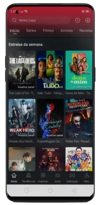 Toque no primeiro ícone inferior (Início). Você encontrará aqui os seguintes gêneros: Estreias da Semana, Cinema, Top Série, Os filmes mais assistidos do Brasil 2025, Programas de TV mais assistidos do Brasil em 2025, Brasil TV, Marvel, Série Godzilla, Netflix, Disney+, Globoplay, Prime Video, Crunchyroll, HBO MAX, Star+, Apple TV+, Paramount+ e por fim Você vai gostar.